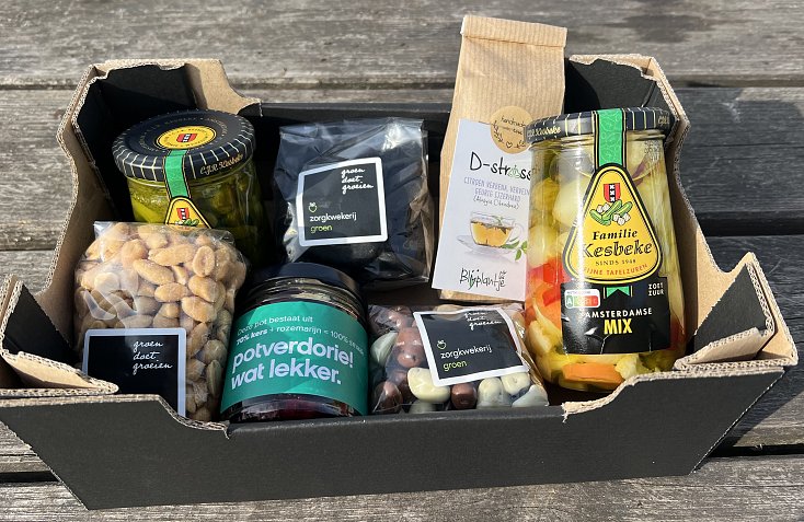 Zorgkwekerij Groen levert jaarrond sociale cadeaupakketten — voor Kerst, Pasen, Moederdag of een bedrijfsjubileum. De pakketten bestaan uit lokale, seizoensgebonden producten van eigen kwekerij en van collega-zorgkwekers en zorgboeren. Eerlijk, lokaal en met een verhaal
